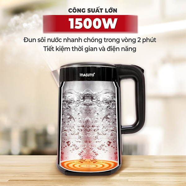 Ấm siêu tốc thông minh 2 lớp Masuto được thiết kế với dáng đứng thon gọn, màu sắc hài hòa phù hợp với không gian bếp hiện đại trong nhà bạn.Dây cắm điện có thể cuộn giấu dưới đáy tăng tính thẩm mỹ cho căn bếp nhà bạn.