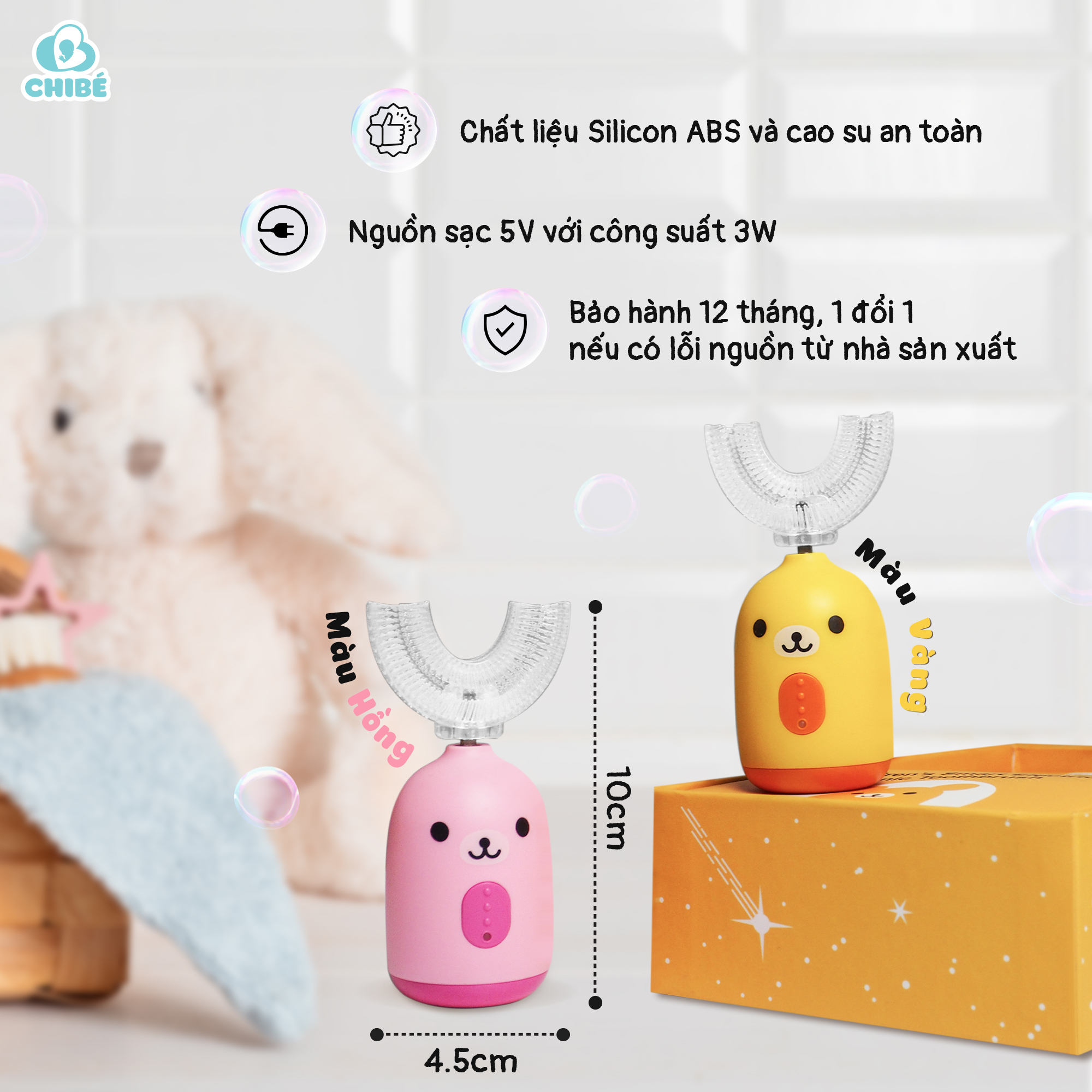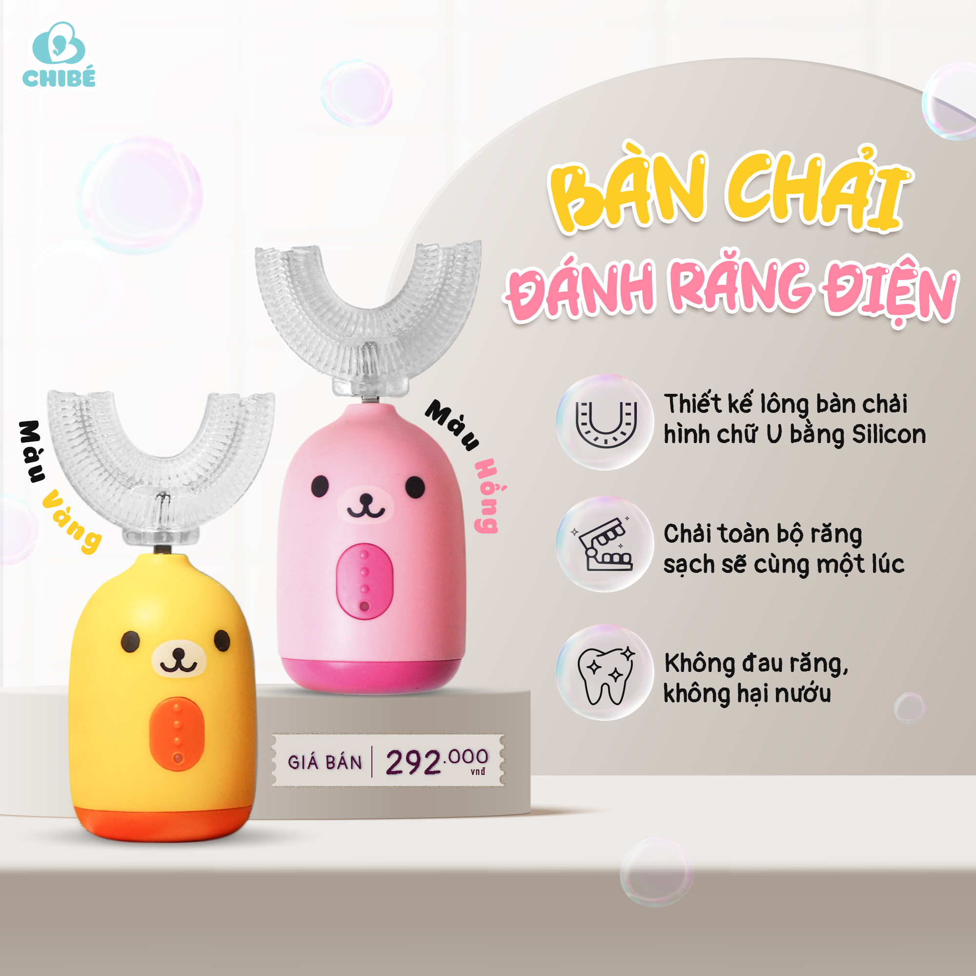Tốt cho răng miệng và nướu hơn bàn chải thông thường, lại được nhiều bé thích mê, cùng làm quen với Bàn chải đánh răng điện trẻ em CHIBÉ CB004 nhé: - Thiết kế lông bàn chải hình chữ U bằng Silicon không gây đau răng và không hại nướu, giúp chải được mọi mặt răng cùng 1 lúc. - Nhỏ gọn, chất liệu an toàn cho bé từ 2 - 6 tuổi. - Tần số rung 32.000 vòng/phút làm sạch sâu. - Dễ vệ sinh với khả năng kháng nước, kháng bụi bẩn IP-X7. - Công nghệ sạc bằng đế sạc ko dây.