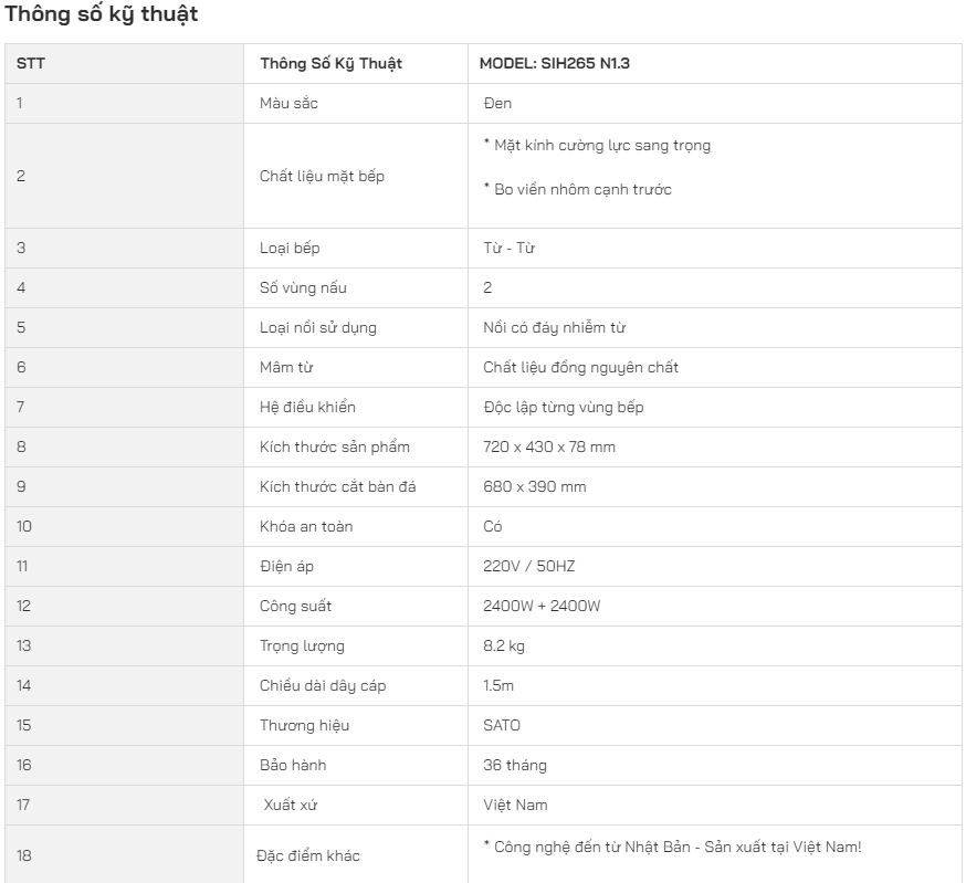 Thông tin sản phẩm bếp đôi điện từ Sato SIH265 N1.3