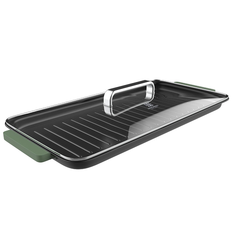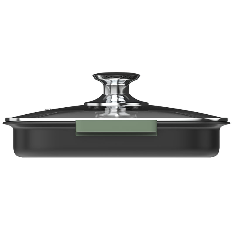 Chất liệu thép, bên trong đáy được dập các gân nổi và được phủ chất chống dính Ceramic không độc hại, không bong tróc trong quá trình sử dụng, chống cháy, dễ dàng vệ sinh, lau chùi. Tay cầm bằng cao su chịu nhiệt. Nắp đậy bằng thủy tinh cường lực, chịu được nhiệt độ cao, núm cầm bằng nhôm hợp kim không bắt nhiệt, chống bắn mỡ khi nướng, mép được bọc inox bảo vệ tạo độ thẩm mỹ, hạn chế va đập rất tiện khi sử dụng.