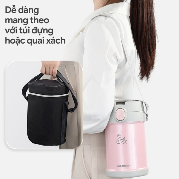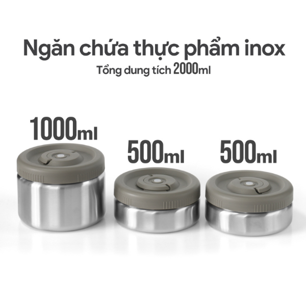 Sản phẩm bao gồm: Túi đựng, Quai xách, Bình giữ nhiệt, Hộp inox 1000ml (x1), Hộp inox 500ml (x2). Tổng dung tích 2000ml, Đũa inox, Muỗng inox