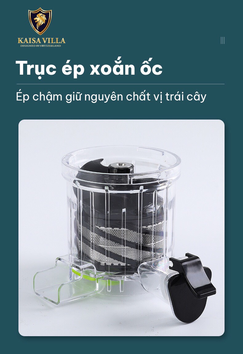 Ưu điểm sản phẩm: - Nhỏ gọn khối lượng chỉ bằng 25 % so với máy ép bình thường - Tỷ lệ nước ép nguyên chất 97% Không còn cặn bã khó chịu, tỷ lệ nước ép nguyên chất càng cao, hàm lượng cạn bã càng thấp. Việc thưởng thức nước ép trái cây trở nên tinh tế và hấp dẫn hơn. - Thiết kế cơ học mới trục xoắn ốc, 2 tầng lọc với lỗ siêu nhỏ có kích thước khác nhau Phải mất một năm, sau nhiều lần thử nghiệm để có được kích thước và cấu tạo tầng lọc tốt nhất. Tách bã và nước để đảm bảo tỷ lệ nước ép nguyên chất nhưng không bị nghẽn. - 3 giây để lắp ráp máy ép, 5 giây để vệ sinh máy ép