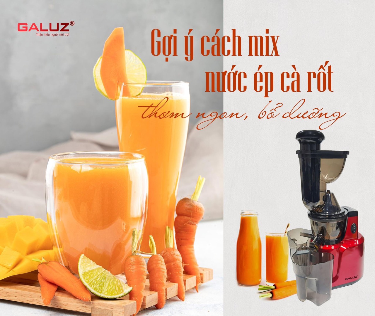- Với máy ép thông thường chỉ sau 15 phút nước ép đã bắt đầu tách nước, đổi màu do bị oxi hóa. Còn với máy ép chậm GALUZ, vì được ép bằng công nghệ ép chậm tiên tiến của Pháp nên luôn giữ được hương vị tươi ngon, đảm bảo giữ được tới 99% lượng dưỡng chất có sẵn trong hoa quả.