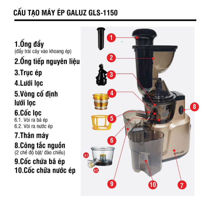 - Máy ép chậm GLS-1150 được trang bị cốc lọc hiện đại với 2 cấp độ lọc: lọc tinh và lọc thô để thu được 2 loại nước ép lẫn ít cái ép và nước ép lẫn nhiều cái ép đáp ứng được nhu cầu sử dụng đa dạng