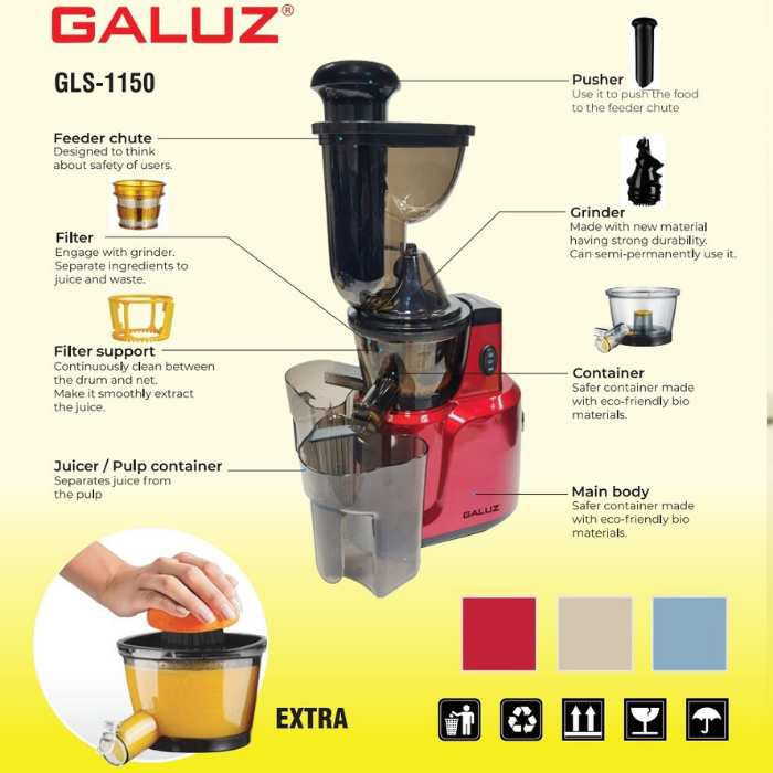 - Ép được tất cả các loại rau củ quả có kích thước đa dạng hơn, với công suất 150W và cửa tiếp thực phẩm lớn, máy ép chậm GALUZ GLS-1150 có thể ép được tất cả các loại rau củ quả cứng như: ổi, cóc, cà rốt, táo… và cả những loại rau có nhiều xơ như cần tây, rau má…