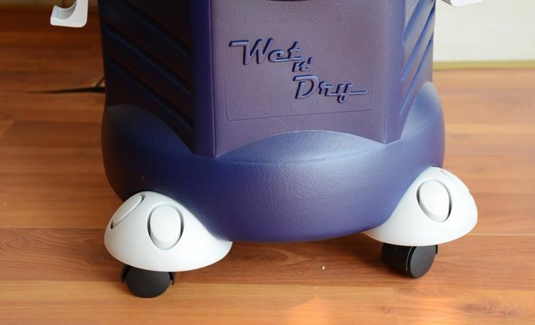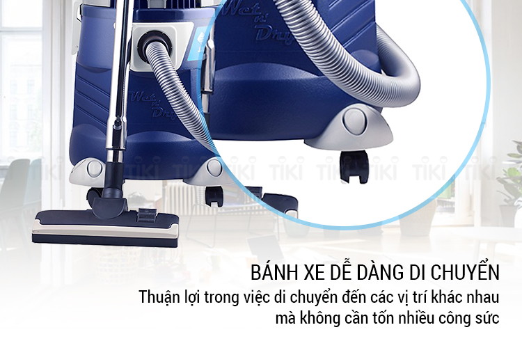Thân máy hút bụi được làm bằng nhựa cho độ bền cao, phía dưới có thiết kế bánh xe chắc chắn, dễ dàng di chuyển khi sử dụng.