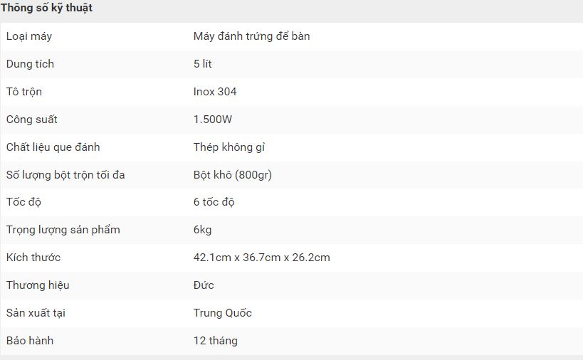 Tô trộn của máy có dung tích 5 lít sẽ trộn được tối đa 800g bột khô. Máy đánh trứng vận hành với công suất 1500W giúp làm việc rất khỏe, ổn định.