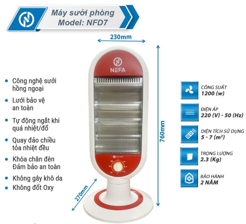– Máy sưởi NEFA NFD7 là một trong những thiết bị sưởi ấm không thể thiếu tại gia đình trong mùa đông. Sản phẩm sử dụng đèn hồng ngoại siêu bền, tỏa nhiệt đều, không gây khó thở và khô da, đảm bảo an toàn cho người sử dụng.