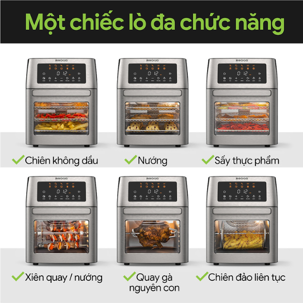 - Thiết kế kiểu dáng hiện đại, sang trọng, tiện dụng - Chất liệu cấu tạo cao cấp tạo độ bền cao - Mang lại cho bạn sự chắc chắn, ổn định và cứng cáp - Dung tích lớn có thể chiên nướng được gà nguyên con - Màn hình cảm ứng siêu nhạy dễ dàng thao tác điều khiển - Nhiệt độ tối đa lớn giúp thức ăn mau chín - Độ ồn thấp không gây ảnh hưởng đến sinh hoạt - 10 chương trình cài đặt sẵn cho bạn tùy chọn theo món ăn - Bảo hành 12 tháng chính hãng