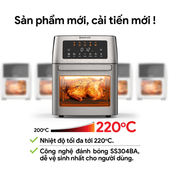 - Dung tích lớn vượt trội 15L. Phù hợp cho Gia đình từ 5-6 người - Thiết kế Cứng cáp và Sang trọng với Chất liệu Inox bền bỉ, An toàn cho sức khỏe - Nhiệt độ cải tiến lên đến 220°C, hơn hẳn các dòng nồi chiên khác trên thị trường (200°C), nấu ăn nhanh hơn, giòn hơn và không cần lật - Lòng nồi từ inox SS304BA, dễ vệ sinh, giữ được độ bóng trơn sau thời gian dài sử dụng - Màn hình cảm ứng với 10 chế độ được cài đặt sẵn thuận tiện và nhanh chóng - Bổ sung thêm các chế độ đặc biệt như: Sấy Hoa Quả, Quai gà nguyên con 360 độ, Lồng đảo khoai, Xiên Quay,… - Cửa kính trong suốt, Dễ dàng quan sát Thực Phẩm trong quá trình chế biến, Phù hợp cả với người lớn tuổi - Phím Đèn và Khóa chế độ nấu được thiết kế riêng biệt, thuận lợi khi sử dụng
