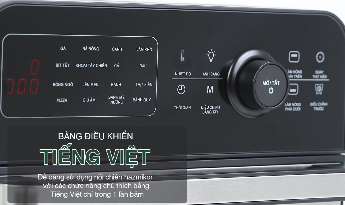 - Nồi chiên không dầu Hazmikor 16l được thiết kế có 3 chế độ nhiệt giúp thuận tiện cho việc nấu nướng: Chế độ 1 - Nguồn nhiệt trên; Chế độ 2 - Nguồn nhiệt dưới; Chế độ 3 - Nguồn nhiệt kép.