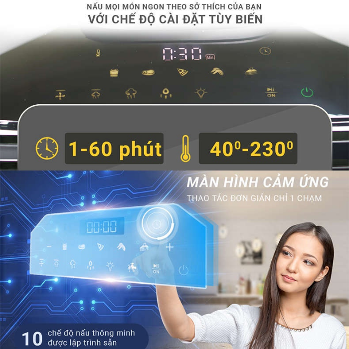 Sử dụng cảm biến nhiệt NTC siêu chính xác kết hợp với đồng hồ hẹn giờ giúp bạn nấu nướng một cách thoải mái mà không lo đồ ăn bị cháy khét.