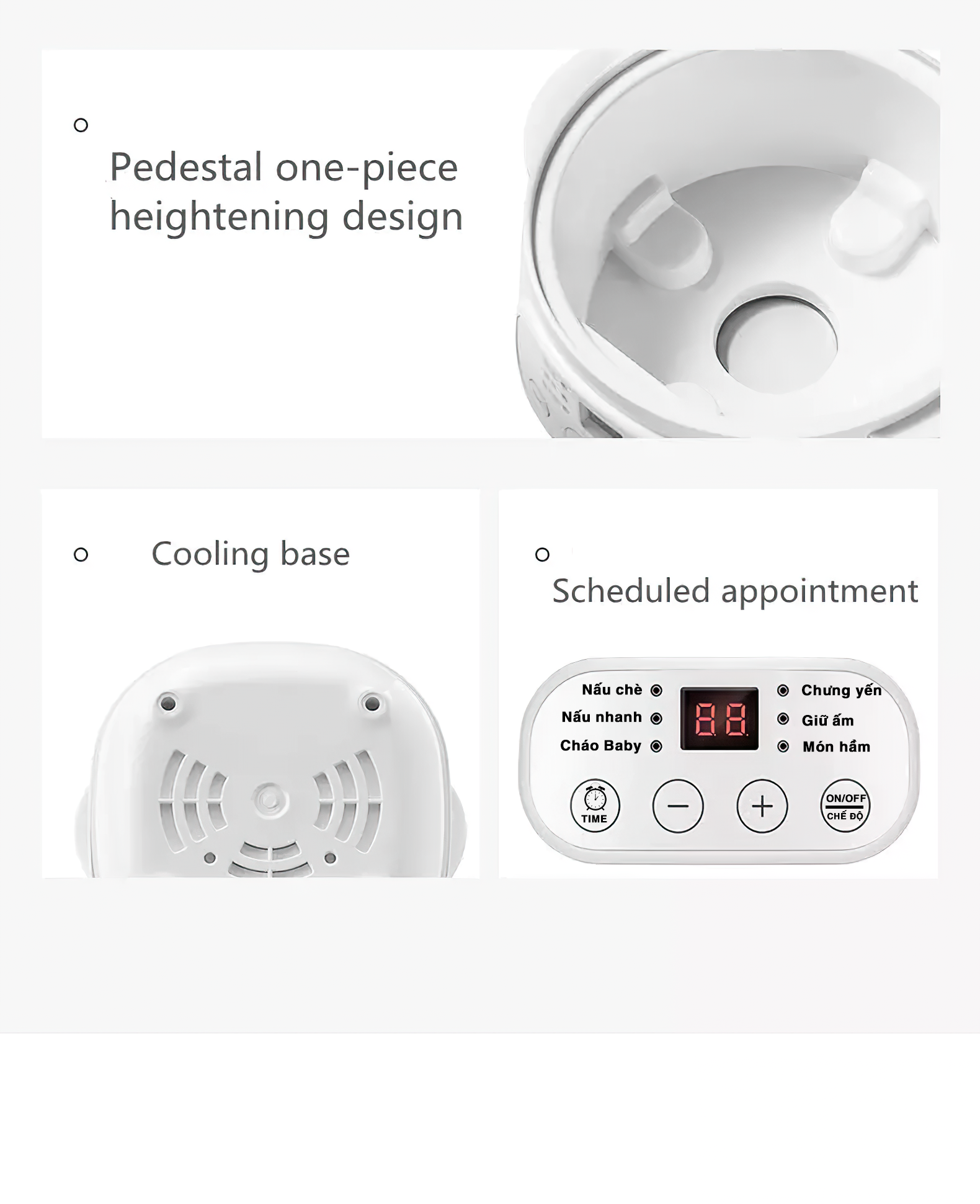 Các chế độ : tráng miệng (nấu súp, nấu chè ) ,nấu nhanh, cháo dinh dưỡng,tổ yến, giữ ấm,món hầm