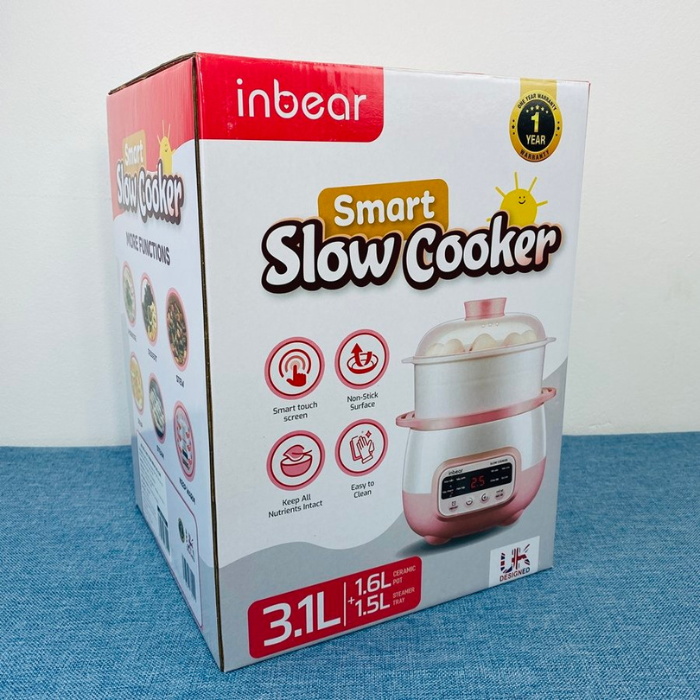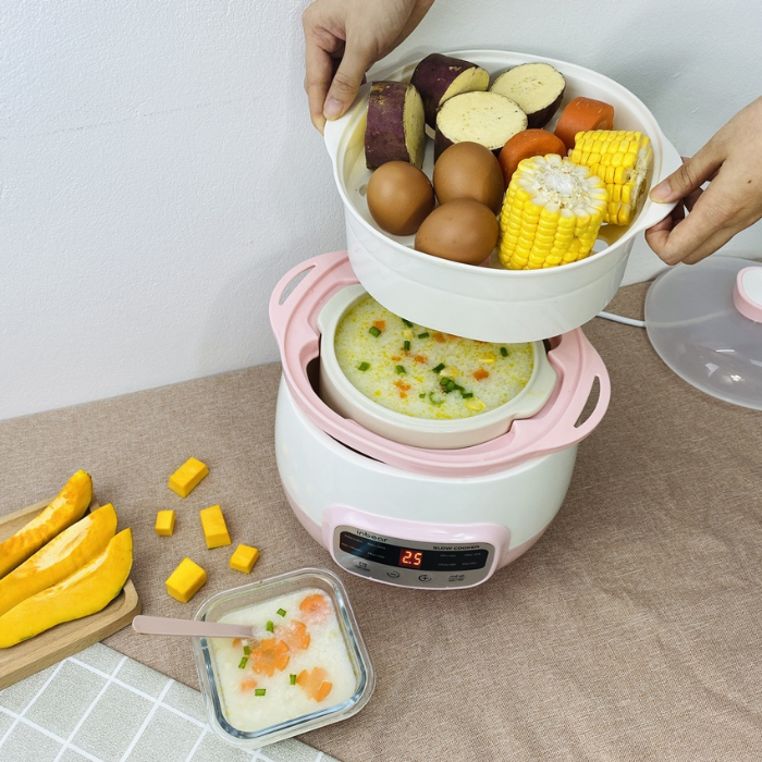 ƯU ĐIỂM NỔI BẬT CỦA NỒI NẤU CHẬM INBEAR: + 8 chế độ nấu: Nấu cháo, món hầm, nấu cơm, món hấp, yến sào, nấu chè, nấu nhanh, giữ ấm. + Công nghệ hầm cách thủy làm nóng thức ăn từ từ, giữ nguyên cấu trúc dinh dưỡng của thực phẩm. + Chống trào, chống dính đáy nồi. + Lõi gốm sứ tự nhiên cao cấp, giữ và truyền nhiệt đều. + Hẹn giờ dễ dàng, từ nấu nhanh/ chậm đến giữ ấm tự động tới 9.5h. + Có khay hấp đi kèm, 1 lần nấu được 2 món khác nhau, tiện lợi và tiết kiệm thời gian. + Dung tích 1,6L phù hợp cho gia đình hoặc nấu đồ ăn cho bé. + Hầm cháo ngon sánh mịn, không bị nhão + Ninh xương, hầm gà mềm nhừ, chiết xuất tối đa chất dinh dưỡng. + Chưng yến, nấu chè nở bung, thơm ngon, giữ trọn hương vị, dưỡng chất sẵn có.