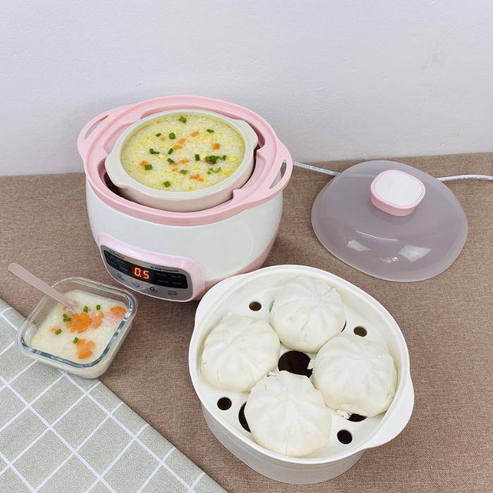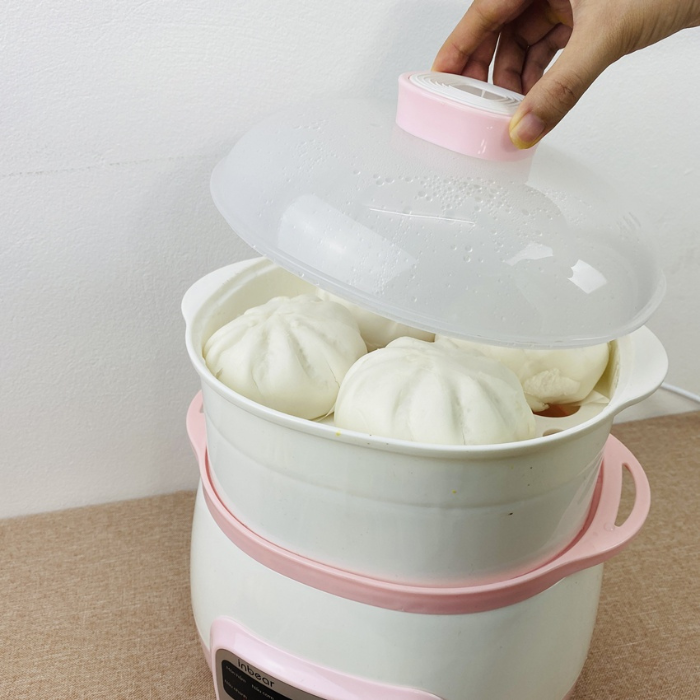 - Màu sắc: Màu hồng nhạt/trắng - Lõi nồi: Thố sứ trắng - Chất liệu: Lõi sứ, lồng hấp nhựa PP